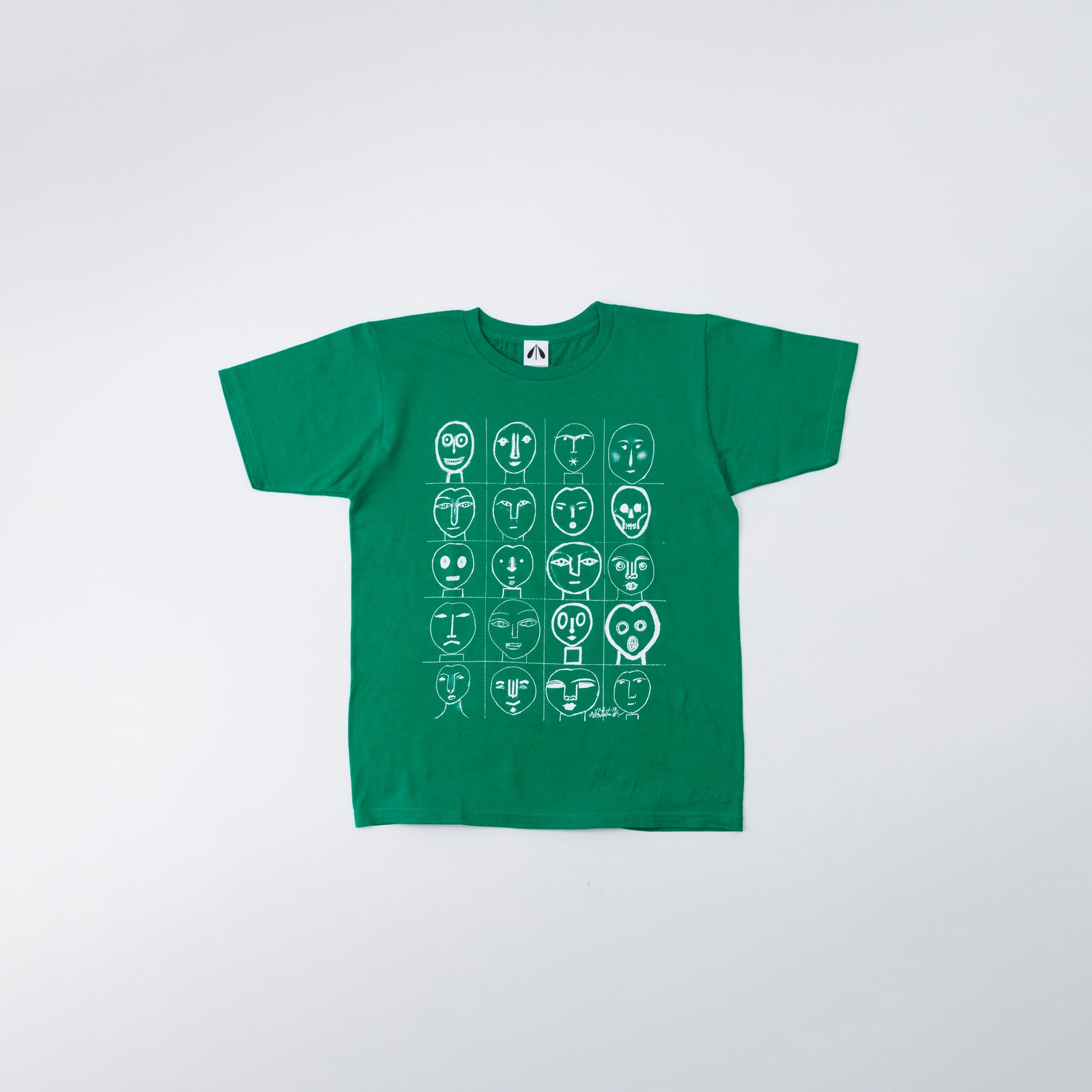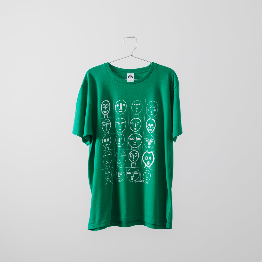 In his later years, Genichiro Inokuma created a series of works titled the 'Face Series,' in which faces are arranged vertically and horizontally within a grid. This T-shirt features one of those works.